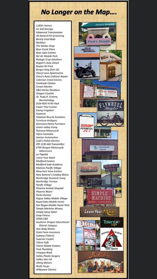 We’re spending hours over the last few days trying to find who lost homes and what businesses are gone in southern Oregon, where Ashland, Talent, Phoenix, and south Medford were fire struck a week ago. This is circulating Facebook and speaks volumes.