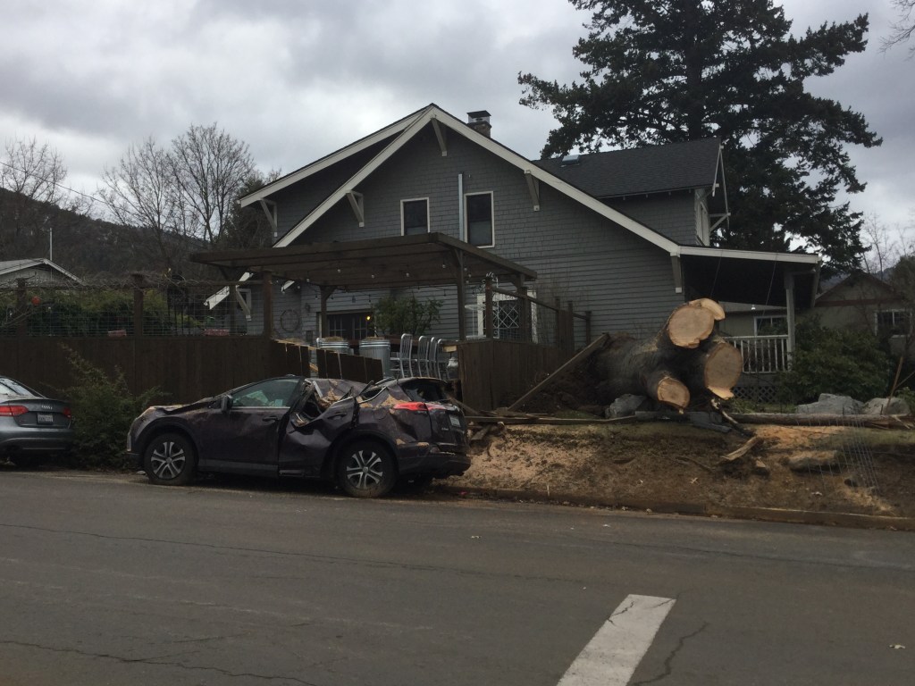 This was down at the bed and breakfast occupying the corner of Siskiyou and Clay Street. Both of the damaged cars park on Clay, across the street from each other. I live up Clay, for perspective.