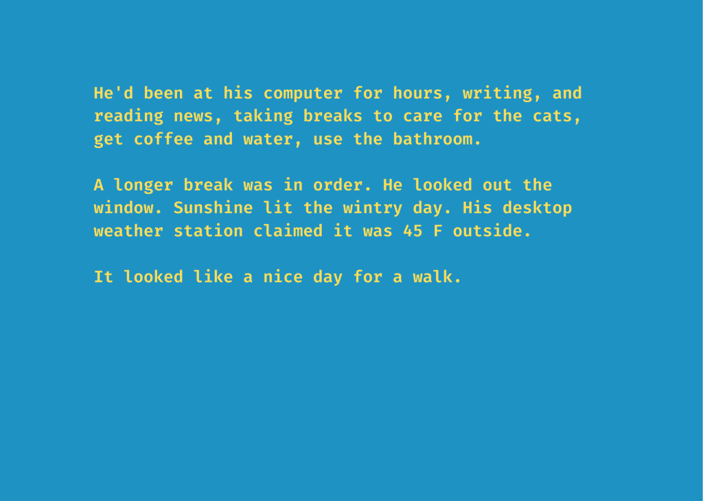 Finished editing and revising The Constant. Final results: 391 pages, 106,291 words. Speculative science fiction mash up. I’ve worked on it throughout the coronavirus pandemic, beginning it around the time in March of 2020 when wearing masks, social distancing, isolation, and watching the daily case numbers became the new norms of the age. I’d been forced into a change of my writing practices. I liked walking to get into the writing rhythm, writing in my head as I did, then settling into a coffee shop, comforted and buffeted by the business activities around me, lowering my head and writing for a few hours. That was all forced aside under COVID-19 rules. Staying at home, shifting into the writing rhythm without the associated rituals was an exhausting, frustrating shift.