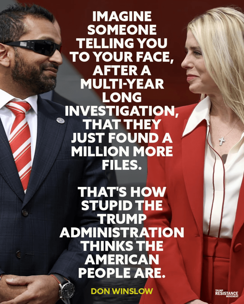 Trump’s minions: “We’re going to announce that Justice just discovered one million more Epstein files.”