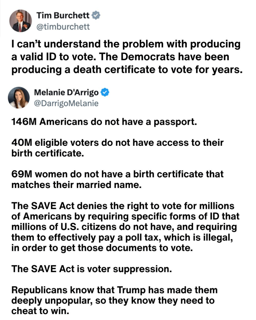 Meanwhile, Trump is pushing hard getting the SAVE Act passed. It’s more classic FAFO moment. We know the ramifications of the act if it passes. We’re not the fools Trump thinks we are. Neither are the Democrats in Congress refusing to go along with the SAVE Act, no matter what Trump threatens.