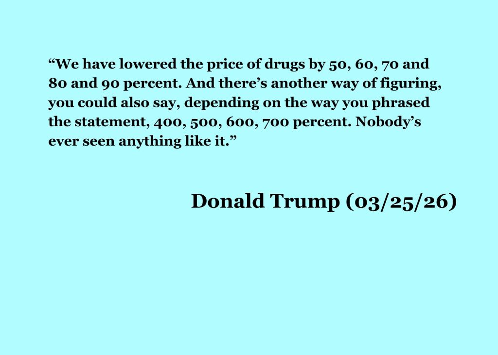 1. When we get the Trumpian Math of saving us anything over 100% (which would mean the “stuff” is free), I keep waiting for my checks in the mail from the pharmaceutical companies. 700% savings? With that kind of payment I might be able to put gas in my tank!