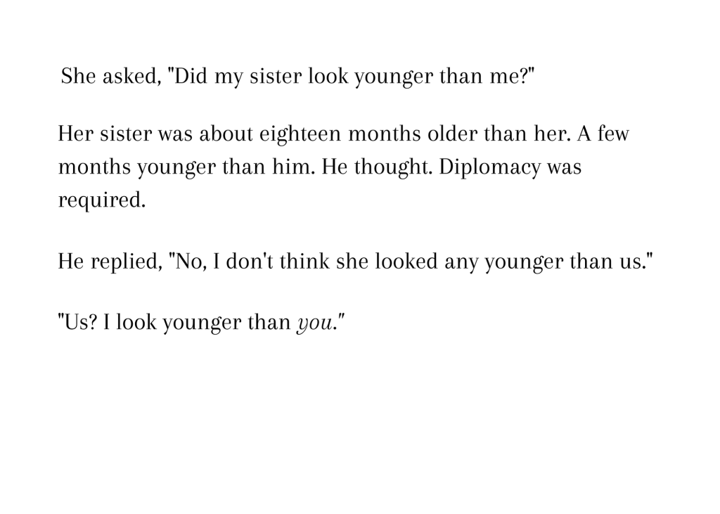 I went back and joined the group at a short track where a car race was scheduled to take place. All were surprised and taken back. One or two made fun of me for it. Then we split up. Most headed in to watch the race but one other and I stayed back, sort of watching the group’s belongings in a small corner by a counter. Catching my image in a mirror, I was horrified. “I look terrible,” I said. “Ridiculous. What was I thinking?”