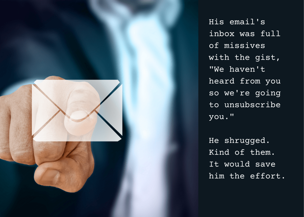 Emails pack his inbox. He subscribes to emails driven by his interests. But many that he subscribes to make him pay for it by sending him three to six emails per day beyond his basic requests. This season is particularly miserable, a terrible trifecta of politics, holiday sales, and dire health warnings. It drives him one more time to sigh, close his email, and think about giving that thing up.