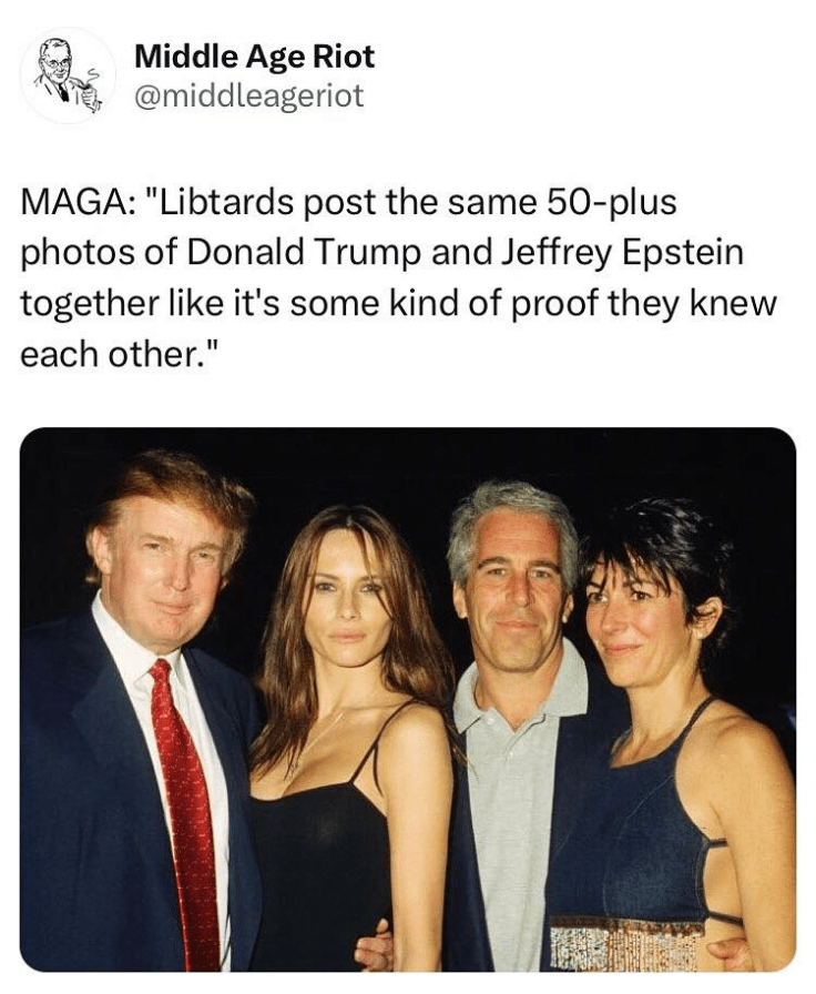 Some say it’s because he can’t sleep at night because worries about the Epstein files revelations drive him to midnight sessions of shitposting. Rumors are that Epstein’s ghost has begun haunting him, whispering in Dizzy Donny’s ears reminders of what a failure he is, how weak and vulnerable Deceitful Donny is, and how Duplicitous Donny’s failures are catching up to him. Once BFF with Epstein, TACO now tries to claim he barely knew the guy.
