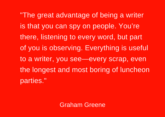 I like spying on people. I haven’t done any peeping tom sort of thing, no. I like sitting back at the cafe and observing exchanges, body language and expression. I eavesdrop when I can. I like looking at the books they carry to see what they’re reading.