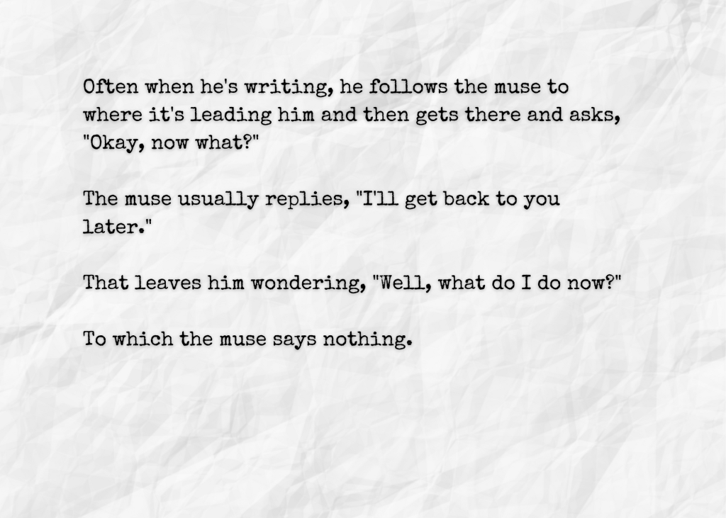Sometimes, I think I’ve found all the crumbs and I’m forming a sense of what’s going on. Then the muse backtracks on me, and I discover old bread crumbs that I previously missed. “Where does this fit?” I shout into the dark forest.