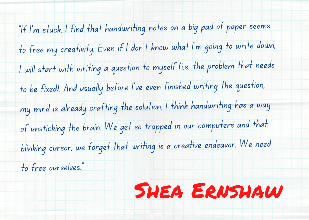 One thing she revealed was that she’d begun using a typewriter to write. She’d slowly stopped writing as much as she used to write, and thought that part of her issue was that she found herself editing as she wrote when she used a computer. That process curtailed her productivity. Typing the work in progress, at this point essentially defining the concept, helped her because she held tangible evidence in her hand each day.